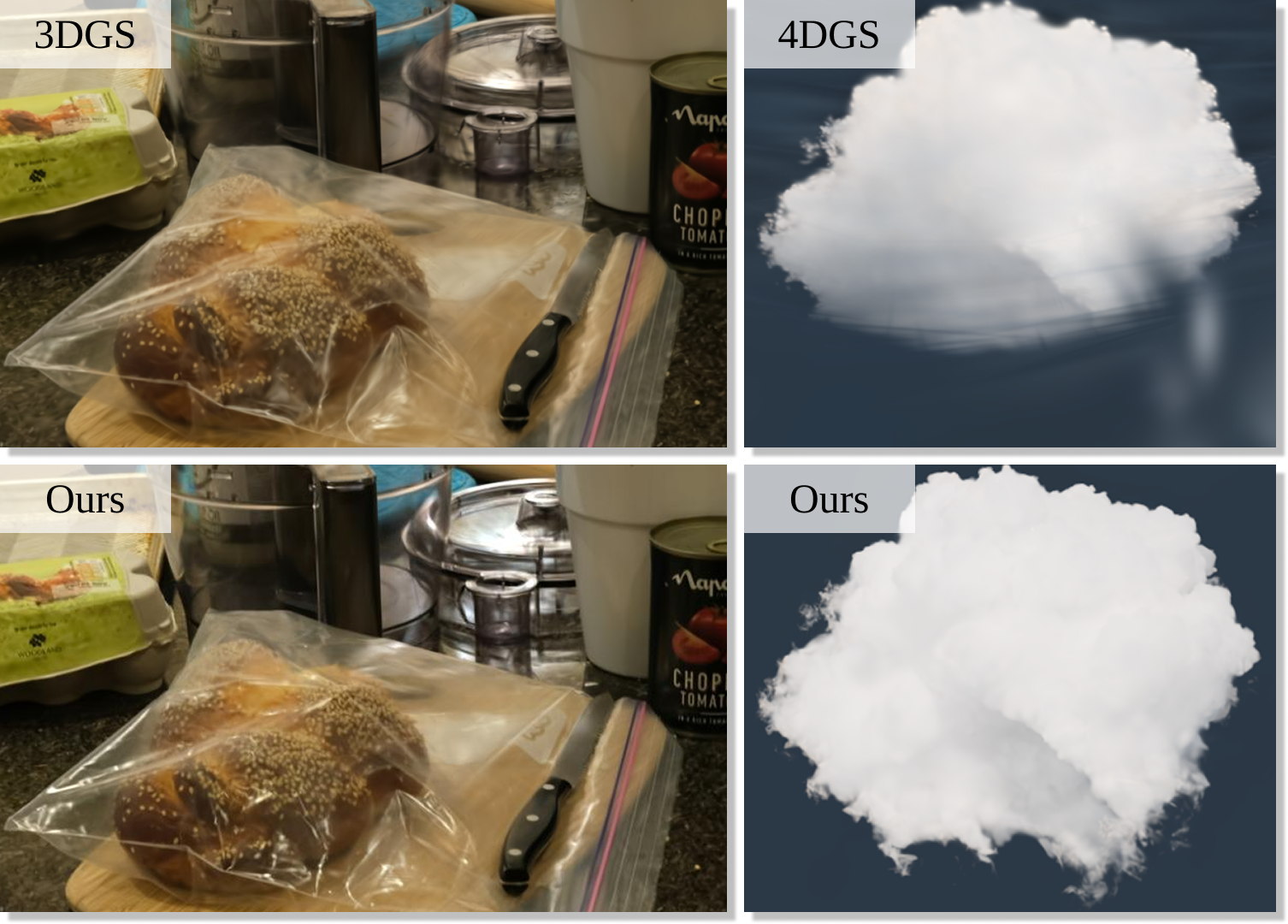 Universal Beta Splatting Rong Liu, Zhongpai Gao, Benjamin Planche, Meida Chen, Van Nguyen Nguyen, Meng Zheng, Anwesa Choudhuri, Terrence Chen, Yue Wang, Andrew Feng, Ziyan Wu ICLR 2026 A unified framework that generalizes 3D Gaussian Splatting to N-dimensional anisotropic Beta kernels for explicit radiance field rendering. Beta kernels naturally decompose scene properties into interpretable components (surface vs. texture, diffuse vs. specular, static vs. dynamic) without explicit supervision. [arXiv] [project page] [code] |